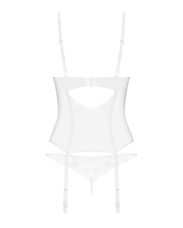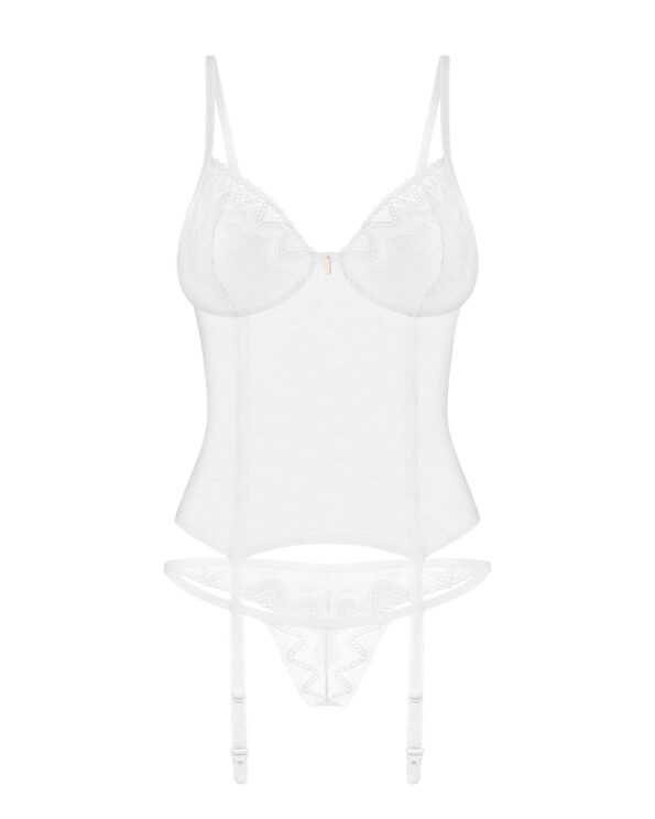Corset et string AlissiumUn ensemble séduisant créé avec des femmes confiantes à l?esprit. Il combine des détails intéressants, transparent blanc et inserts en dentelle. Cette lingerie vous rendra irrésistible et attirera toute l?attention sur vous! – corset et string blancs – armatures en bonnets- possibilité d?ajuster les bretelles et jarretelles non détachables- fermeture à plusieurs étages à l?arrière- une décoration en or rose- délicats accents de dentelle- 94 % polyamide, 6 % élasthanne- conçus dans l?UE- ne contient pas de nickel
