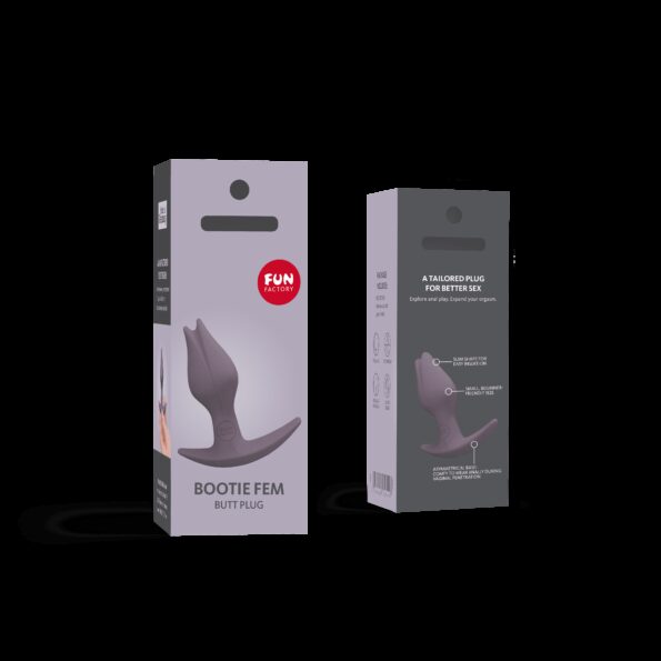 VOUS ÊTES BELLEBase asymétrique : confortable à porter par voie anale pendant la pénétration vaginaleConception innovante : sexy et sans danger pour le corpsForme étroite pour une insertion facileLe premier jouet anal parfaitPrépare le corps à des jeux anaux plus avancésRespectueux du corps et de l’environnement, avec un emballage efficace TypeFemale Butt PlugDimensions8,5 cm and Ø 1-2,9 cmWeight38 gMaterials100% medical grade silicone, non-porous and hypoallergenic FAIT JUSTE POUR VOUSVous êtes une personne avec un vagin et vous cherchez un plug anal adapté à votre anatomie ? Ou bien, vous ne voulez pas être gênée par la garde de sécurité du plug anal lorsque vous choisirez d’avoir en même temps, une pénétration vaginale ? Vous êtes au bon endroit. BOOTIE FEM est un plug anal qui a l?élégance d?une tulipe, ultra confortable, adapté aussi pour c.elles.eux qui débutent en matière de stimulation anale et conçu pour être porté pendant les rapports sexuels, pour des méga-orgasmes FUNtastiques.Une des particularités de BOOTIE FEM c?est qu?un côté de la garde de sécurité est plus court que l?autre et permet une pénétration vaginale sans être gênée par le plug. Sa forme et son inclinaison exercent indirectement une pression sur le vagin. Lors de la pénétration vaginale, le pénis est fortement enserré, non seulement cette étreinte procure des sensations intenses et inédites pour chacun mais aussi cette position stimule doublement en appuyant sur la face postérieure du point G. C?est l?effet papillon !LA CERISE SUR LE GÂTEAUBase asymétrique pour permettre une pénétration vaginale sans être génée par sa garde de sécurité.LE PLAISIR EN SOLO, MAIS MIEUXavec une stimualtion vaginale ou clitoridienne et atteignez des orgasmes exceptionnels.SENSUELLE ET DISCRÈTE Portez BOOTIE FEM en faisant du shopping, pendant une réunion, ou lors de votre prochain rendez-vous galant. Sa garde de sécurité est invisible sous vos vêtements.PLUG ANAL POUR LES PERSONNES À VULVENotre BOOTIE FEM est le premier plug anal pour les personnes à vulve. Petit, effilé au bout, en silicone velours, il est idéal pour les personnes avec ou sans expérience anale. Il amène renouveau et FUN dans la sexualité du couple. Il donne la force d?enserrer intensément le pénis de son partenaire et ajoute plus de sensations lors de la pénétration vaginale. Au final ce sont des orgasmes à couper le souffle.QU’EST-CE QUE LE BOOTIE FEM A DE SI SPÉCIAL ?BOOTIE FEM est un plug anal conçu pour l?anatomie des personnes à vulve et est spécialement adapté pour être porté lors de la pénétration vaginale. Sa particularité ? La côté de la garde de sécurité orienté vers le vagin est plus court que l’autre pour permettre une pénétration vaginale sans être gênée. Ce plug anal féminin, en forme de tulipe, est très facile à utiliser, il est surtout le symbole d’une jouissance épanouie !QUE FAIT TRÈS BIEN LE PLUG ANAL BOOTIE FEM ?Les nombreuses terminaisons nerveuses situées dans et autour de l’anus sont incroyablement sensibles à la pression et à l’étirement, plus elles sont stimulées, plus votre orgasme sera intense. Et si vous portez le plug pendant la pénétration vaginale, BOOTIE FEM exerce une pression indirecte qui guide le pénis ou le jouet directement vers le point G. C?est une stimulation trois en un, anale, vaginale et point G, elle fait mouche à tous les coups.BOOTIE FEM EST-IL CONFORTABLE À PORTER ?Comme expliqué précédemment, BOOTIE FEM a été conçu pour les personnes à vulve. Sa garde de sécurité est si étroite, ergonomique, et de surcroît sûre et 100% discrète que même sous un pantalon moulant, on ne voit rien. En forme de tulipe, étroite et effilée au bout, elle permet une insertion en douceur et celles qui voudront passer le pas n?auront plus peur d?avoir mal !Conseil : Pour votre confort soyez généreux avec le lubrifiant.LE BOOTIE FEM EST-IL FACILE À NETTOYER ?BOOTIE FEM est fabriqué en silicone de qualité 100 % médicale. Fait d?une seule pièce, moulé dans la masse, ce toy anal sans raccord se nettoie facilement à l?eau tiède avec un savon doux.