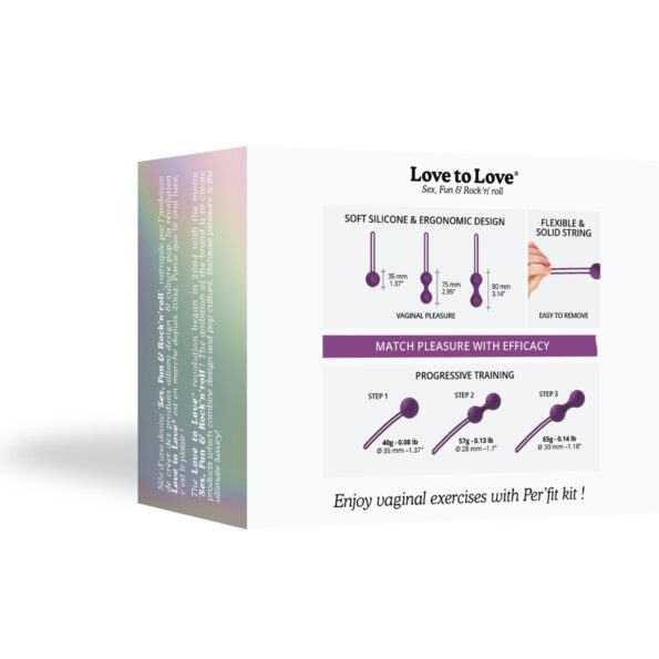 Quand plaisir rime avec efficacité. PER?FIT KIT est le fidèle allié de votre périnée ! Ce kit d?entrainement propose 3 boules de geisha, de poids, diamètres et longueur différents, pour vous muscler à votre rythme et selon vos envies. En utilisant PER?FIT KIT, chacun de vos mouvements sollicite les muscles de votre périnée qui se contractent naturellement pour un entrainement progressif sans effort en toute discrétion ! Son ergonomie et sa douceur permettront une insertion facile en toute sécurité pour un confort optimal. Ce trio gagnant permet de renforcer progressivement les muscles vaginaux pour des orgasmes intensifiés ! Optez pour Per?fit kit et reprenez le contrôle de votre corps ! CARACTERISTIQUES TECHNIQUESSiliconeUtilisation : vaginalePoids des boules : 40g ; 57g ; 65gDiamètre des boules : 35mm; 28mm; 30mmLongueur insérable des boules : 35 mm; 75 mm; 80 mmSilencieuxWaterproof AVANTAGESKit d?entrainement progressif pour renforcer le périnéeDoux & ergonomique pour une insertion optimaleFicelle résistante et flexiblePour tous niveaux : du novice à l?expert