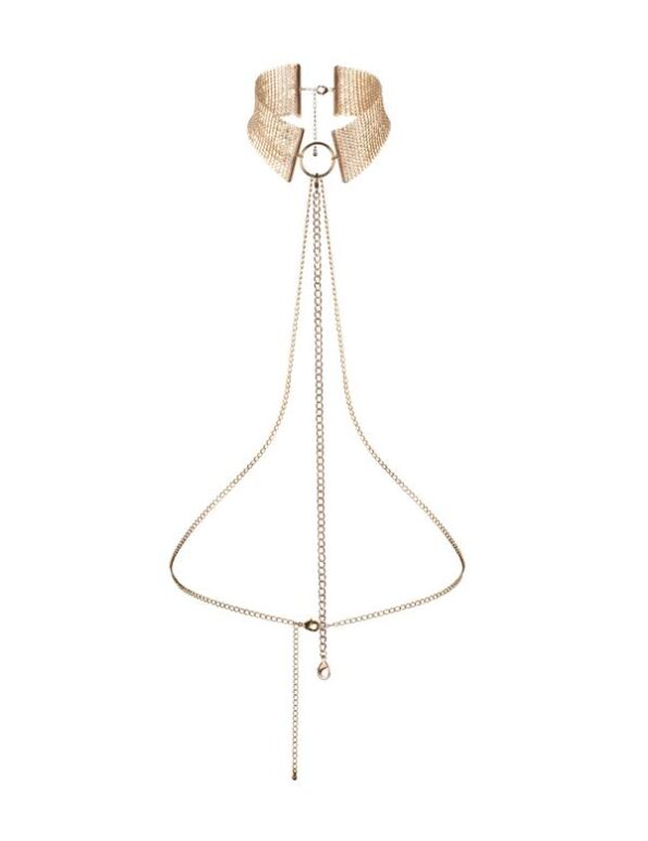 Un collier prêt-à-porter élégant qui dissimule un harnais délicat. Ce bijou sublime le corps nu et reprend les codes du soft bondage.