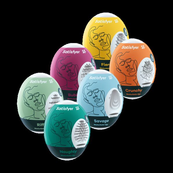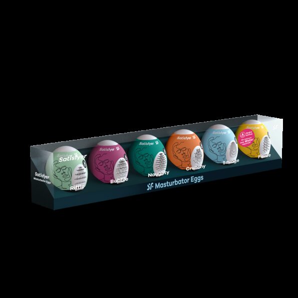 Informations produit « Ensemble de masturbateurs Egg, 6 pièces » Avec leur structure semblable à la peau, nos Eggcited Eggs ravissent à la fois le corps et le bout du pénis. À l?intérieur, différentes structures excitantes et surprenantes vous offrent des sensations variées. Et grâce à la Cyberskin innovante, vous n?avez besoin d?aucun lubrifiant supplémentaire. Fabriqué à partir de TPE doux et hydroactif qui peut être humidifié avec une petite quantité d’eau ou de salive. Un parfait compagnon de voyage grâce à sa taille compacte Stimule tout le pénis 6 structures sensuellesPour le voyageDestiné à un usage unique Satisfyer Masturbator Eggs : Une aide efficace à la masturbation lorsque tu es en déplacement Avec les Satisfyer Masturbator Eggs dans un ensemble pratique de 6 pièces, tu as toujours ce qu?il faut avec toi. Les ?ufs de masturbation sont à usage unique : le design est en forme d??uf, discret, et est donc idéal pour un soutien rapide en déplacement. Le matériau innovant des ?ufs est un TPE flexible et hydroactif, qui peut être humidifié avec une petite quantité d?eau ou de salive et assure ainsi une sensation de douceur et un plaisir réel. Tu n?as besoin d?aucun lubrifiant, ce qui est extrêmement pratique pour un plaisir facile en déplacement. Bubble et Naughty chouchoutent ton membre viril avec des picots arrondis excitants, tandis que Riffle et Fierce t?inspirent avec leur structure sensuelle rainurée et en spirale. Savage fournit une stimulation supplémentaire avec des ondes. Avec sa structure nervurée abstraite, Crunchy complète cet ensemble varié de 6 pièces.