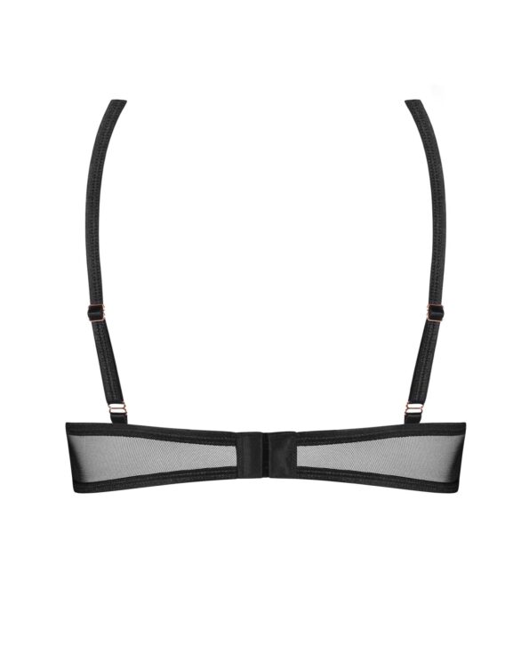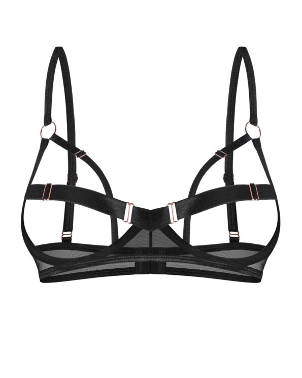 Soutien-gorge ouvert Euridia Un mélange de design ouvert et de style contemporain qui laisse peu de place à l?imagination. Défie les conventions, offrant une allure audacieusement révélatrice. Embrassez et explorez la liberté d?une sensualité audacieuse. Le soutien-gorge combine un design classique avec des détails modernes. Un design ouvert [quart de poitrine] en noir, décoré d?accessoires métalliques délicats dans une nuance d?or rose. Avec des longueurs de sangle réglables et un ajustement personnalisable assuré par une fermeture à crochet et à ?il, ce soutien-gorge promet à la fois confort et confiance. ? Soutien-gorge Euridia? poitrine ouvertes? à armature? fermeture réglable à l?arrière? bretelles ajustables? Accessoires rose doré. conçu dans l?UE? 94 % polyamide, 6 % élasthanne