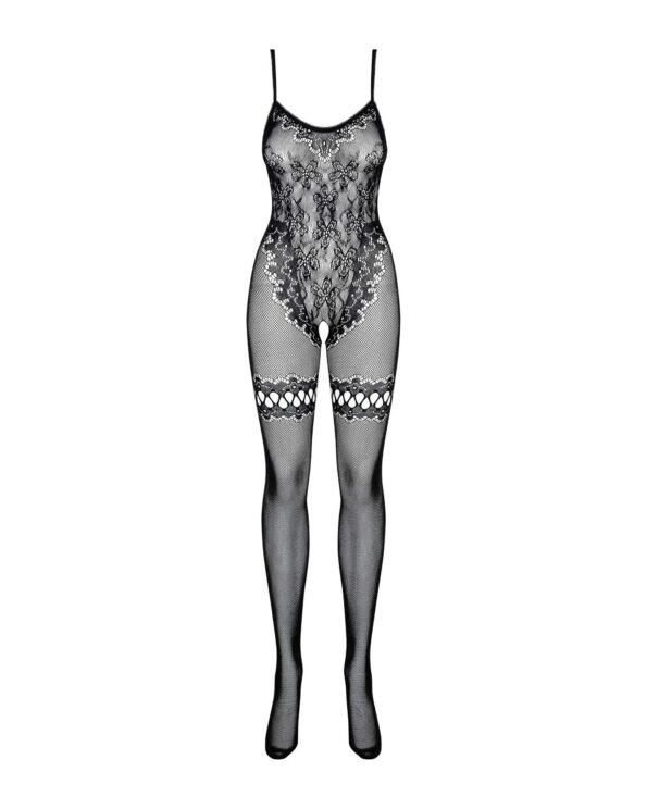 Combinaison ultra féminine à motifs floraux. Séduisante grâce à ses dessins floraux subtils. Résille décorée de lignes verticales ayant un effet amincissant. Ouverture sur l’entrejambe. Decorations sur les jambes, imitation « bas »· Composition : 90% nylon, 10% Élasthannee