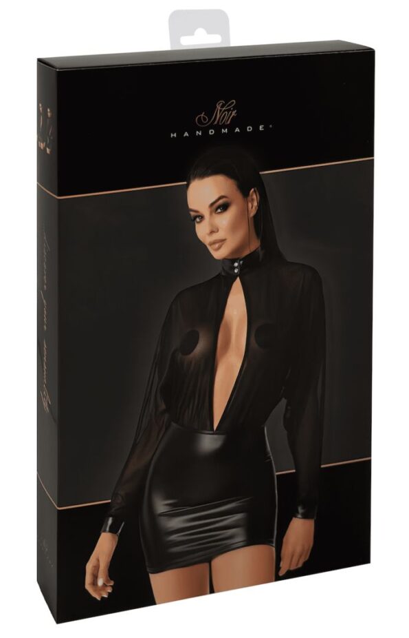 Description du produitWetlook élastiquePowernet élastiqueBoutonsMini robeDos nuTransparent Cet ensemble captivant associe l’élégance de la maille transparente à l’audace du tissu Stretchy Power Wetlook, créant un look à la fois audacieux et sophistiqué. Parfaite pour celles qui aiment se faire remarquer, cette tenue est conçue pour faire tourner les têtes et laisser une impression durable.Matériau:Top: Le top est fabriqué dans une maille transparente et élastique qui offre une sensation de douceur et d’aération. Les manches longues et le col montant ajoutent une touche de sophistication, tandis que l’ouverture sur le devant et dans le dos donne de l’audace.Jupe: La mini-jupe ajustée est fabriquée en tissu Stretchy Power Wetlook, offrant une silhouette élégante et ajustée qui contraste magnifiquement avec le haut volumineux en maille.Design: Le haut en maille est doté d’un col et de poignets à boutons-pression réalisés dans le même tissu Wetlook que la jupe, ce qui permet de relier les deux éléments. Le dos ouvert et le devant plongeant ajoutent une touche d’audace à l’élégance du modèle, le rendant parfait pour les sorties audacieuses comme pour les moments intimes.Coupe: La jupe est taillée pour s’asseoir sur la taille, accentuant la silhouette, tandis que le haut se drape librement pour un contraste saisissant entre les formes.Idéale pour les événements spéciaux, les fêtes ou lorsque vous souhaitez faire une entrée remarquée, cette tenue est parfaite pour celles qui apprécient un mélange d’élégance et d’audace. C’est une pièce polyvalente qui peut être stylisée de différentes manières, selon l’occasion, offrant des possibilités infinies pour créer des looks inoubliables. Matière :76% poliester 24 % elasthane enduit de polimère ; dentelle : 85 % poliamide 15 % elasthane
