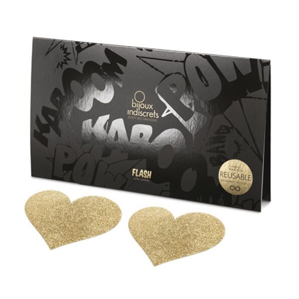 Subtils et chics, ces cache-tétons en forme de coeur dorés s’associent parfaitement avec votre petite tenue de soirée… N’ayez plus peur de sortir votre décolleté. Ces cache-tétons coeur aux paillettes dorées sont réutilisables grâce au silicone adhésif de haute qualité. Souples, ils conviendront à toutes les formes de poitrines pour les embellir.Découvrir la collection de ces cache-tétons flash Un autre coloris : cache-tétons coeur noirs, cache-tétons coeur argent