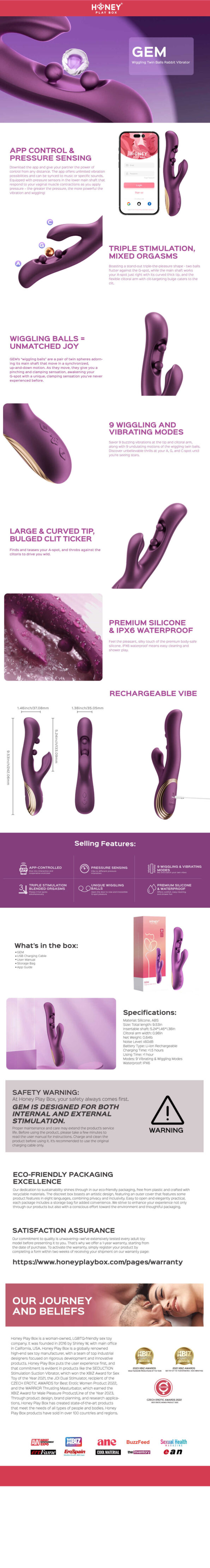 Application Honey Play Box activéeMouvement innovant à double bouleTechnologie de détection de pressionFonctions de stimulation mixablesMatériau sûr et hygiéniqueImperméable pour un jeu aventureuxCONTRÔLÉ PAR APPLICATIONConnectez-vous de manière transparente et explorez des paramètres personnalisés pour une expérience personnalisée.MOUVEMENT INNOVANT À DOUBLE BALLEConçu pour offrir une stimulation rythmique et ciblée pour un confort sur mesure.TECHNOLOGIE DE DÉTECTION DE PRESSIONDes capteurs avancés s’adaptent à vos mouvements naturels, garantissant une expérience unique et réactive.9 MODES POUR PLUS DE VARIÉTÉPlusieurs paramètres réglables vous permettent d’explorer différents rythmes en fonction de vos préférences.MATÉRIAU SILICONE DE QUALITÉ SUPÉRIEUREDoux, sans danger pour le corps et imperméable pour une expérience agréable et hygiénique.MatérielSilicone, ABSTailleLongueur totale : 9,53″ Largeur du bras clitoridien : 0,98″ Tige insérable : 5,24″*1,46″*1,38″Poids net0,64 lbNiveau de bruit? 60 dBType de batterieBatterie rechargeable au lithium-ionTemps de charge1,5 heuresUtilisation du temps1 heureModes9 modes de vibration et de tremblementÉtancheIPX6