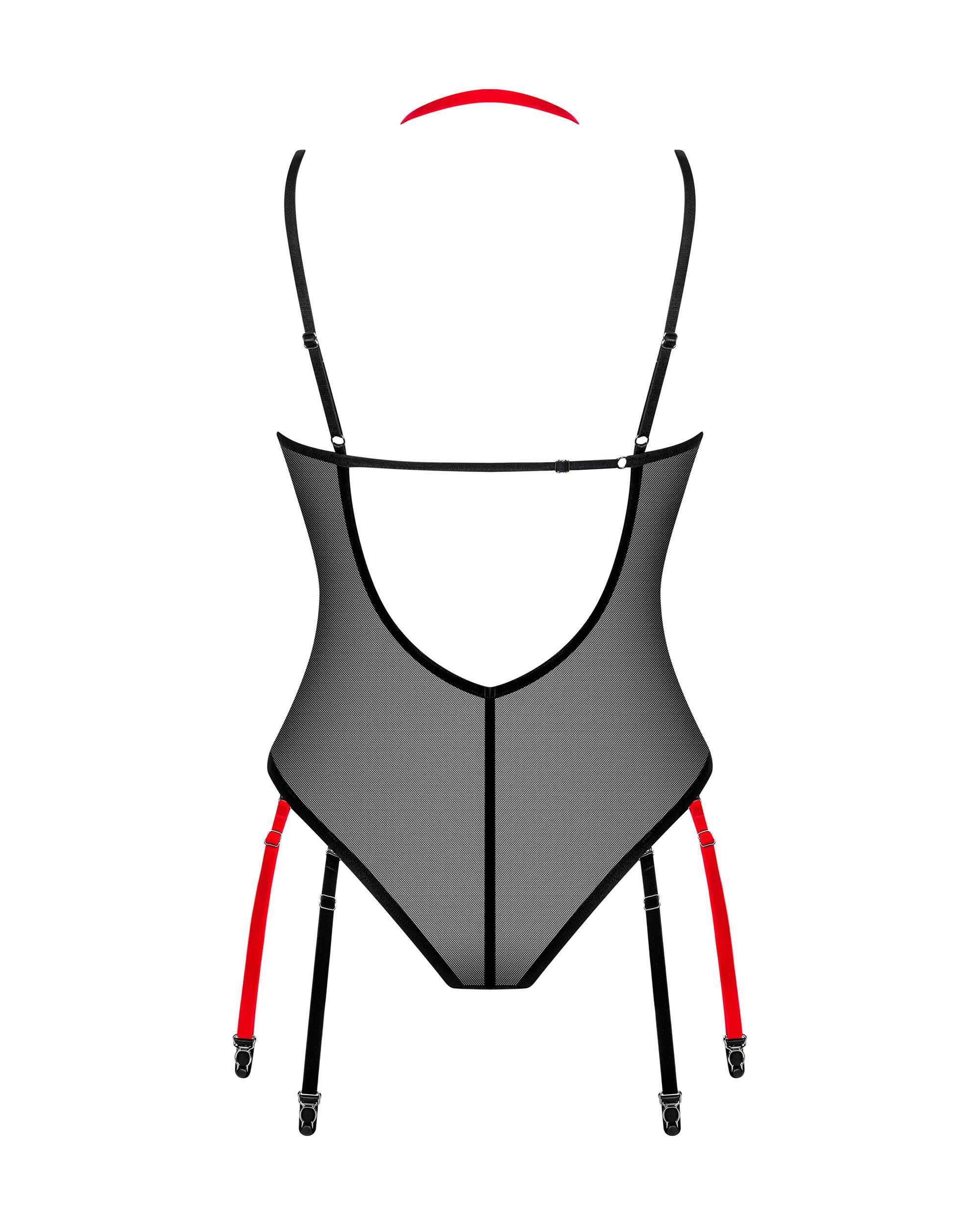 Sentez-vous séduisante et féminine comme jamais auparavant ! Ce body vous apportera le confort que vous méritez. Votre beauté naturelle sera mise en valeur par la coupe minimaliste. Le tissu transparent et le dos nu porté autour du cou mettent subtilement en valeur la poitrine. Soyez sauvage avec du style !Plus de détails :- body noir- coupe qui met en valeur les atouts féminins- ajustement parfait grâce aux bretelles réglables- sangle confortable portée autour du cou- pendentif brillant – donne du style- jarretelles en noir et rouge – à détacher quand vous le souhaitez- tissu délicat au toucher avec des éléments en velours – garantie de confort 94 % polyamide, 6 % élasthanne