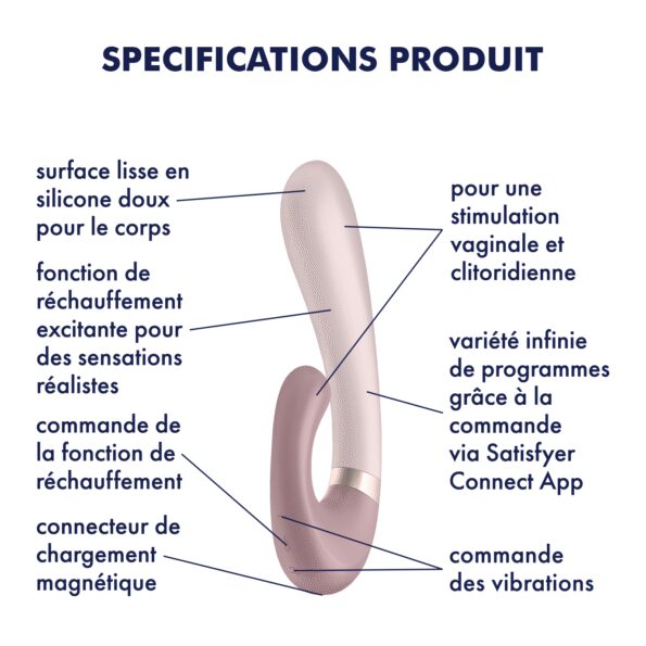Satisfyer Heat Wave Connect App – Mauve : Doublez le plaisir avec les ondes de pression et le massage du point G Notre lapin a reçu une évolution dans le Satisfyer Heat Wave Connect App : Ce vibromasseur s’adapte à vos contours pour vous procurer un plaisir unique. Alors que la tige élégamment incurvée masse votre point G avec des vibrations pénétrantes, les ondes de pression de l’extérieur assurent une stimulation clitoridienne profonde. Grâce à la technologie silicone flex et à un joint de chaîne à l’intérieur, vous pouvez facilement régler le Satisfyer Heat Wave Connect App pour que votre vibromasseur à ondes de pression touche parfaitement votre point chaud et transmette ses vibrations de manière particulièrement intense. La poignée est également suffisamment large pour vous assurer de ne pas perdre votre prise. Les deux moteurs puissants peuvent également être contrôlés indépendamment l’un de l’autre, tandis que 10 programmes de vibration différents et 11 intensités offrent d’innombrables possibilités de combinaison et des plaisirs variés. Satisfyer Heat Wave Connect App – Mauve : Autres bienfaits du Rabbit Le Satisfyer Heat Wave Connect App – Mauve est fabriqué à partir de silicone de qualité médicale, il caresse donc délicatement vos zones érogènes de l’intérieur et de l’extérieur. Sa finition étanche (IPX7) le rend également adapté à une utilisation sous la douche ou dans la baignoire, de sorte que vous puissiez toujours vous amuser lorsque les choses sont mouillées. Après utilisation, vous pouvez facilement nettoyer le vibromasseur avec de l’eau tiède et un nettoyant pour jouets. Le câble de chargement USB fourni garantit également qu’il est rapidement prêt pour des plaisirs passionnés chaque fois que vous en aurez à nouveau besoin.