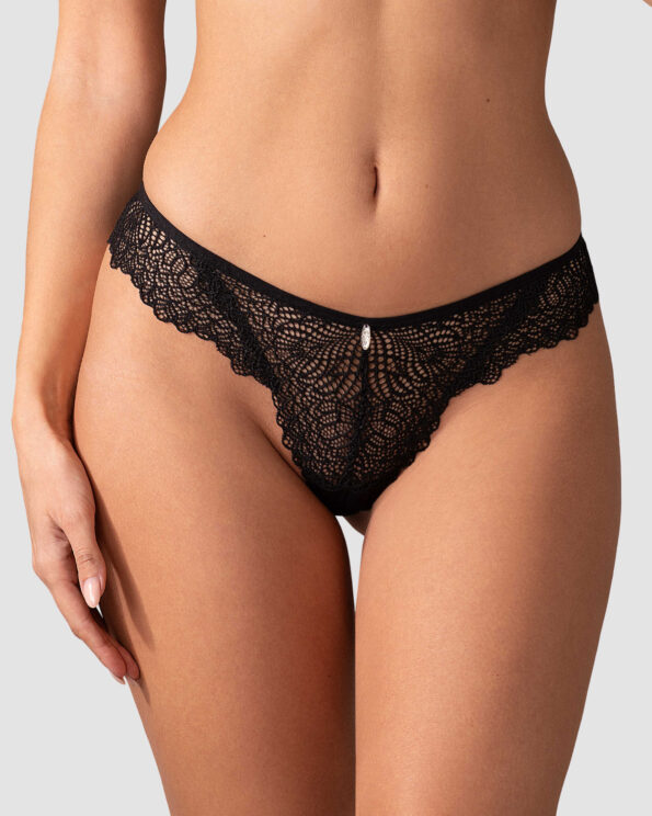 Iliosa PantiesChic et moderne, ces culottes de style brésilien sont fabriquées en dentelle noire douce avec un motif chic et contemporain. Le tissu extensible épouse votre corps pour un ajustement parfait, tandis que la fermeture décorative au dos ajoute une touche d?élégance raffinée. – Culotte classique en dentelle noire- Détails en dentelle – Bracelet avec des accents argentés- 90% polyamide, 10% élasthanne- Conçu dans l?UECe produit ne convient pas aux enfants de moins de 3 ans ? risque d?étouffement dû à la présence de petites pièces qui peuvent être détachées du produit.