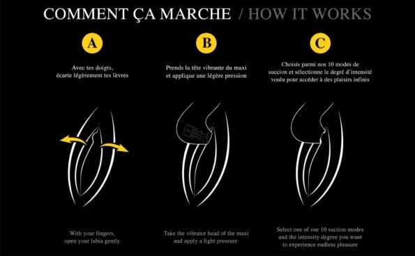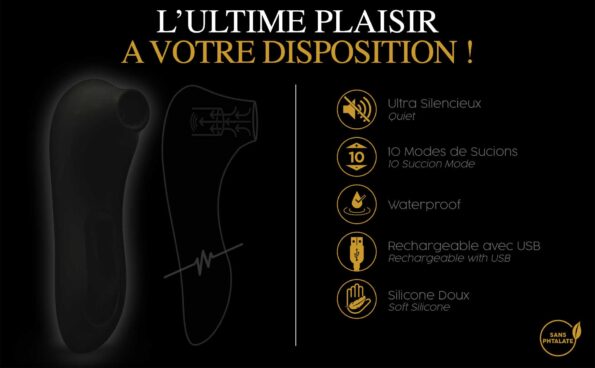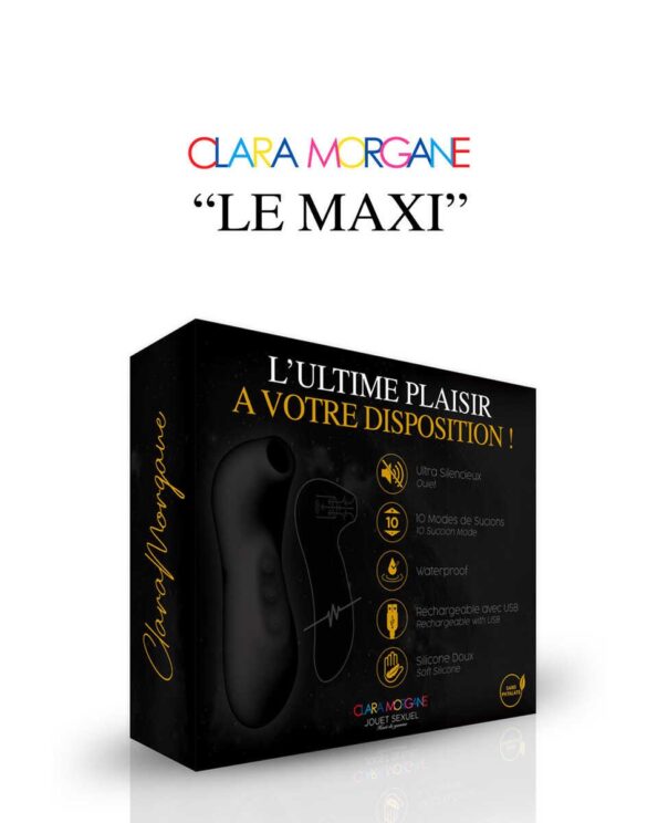 LE MAXI (boite/coffret luxe) :STIMULATEUR CLITORIDIENULTRA SILENCIEUX10 MODES DE SUCIONSWATERPROOFRECHARGEABLE USBSILICONE DOUX Hauteur : 12 cmLargeur : 4,2 cmPoids avec emballage : 140 gMatière : Silicone / ABSPour : FemmeUsage : ClitoridienHealth : sans phtalatesDiamètre : 2,7 cmVibrant : OuiFonctions : 10 modes de vibrationBatterie : Rechargeable USBAlimentation fournie : ouiMoteurs : 1Modes vibration/utilisation : 10Waterproof : WaterproofType de batterie : Batterie Lithuim intégréeTemps de charge : 2hPrix de vente conseillé : 89,90 ?