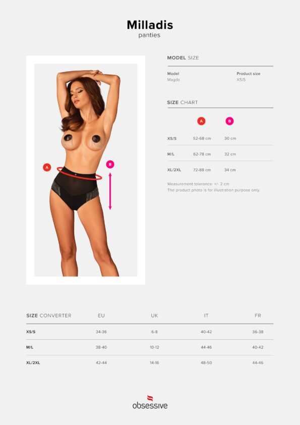 La culotte taille haute de la collection Milladis est un véritable bijou dans l’univers de la lingerie. Une coupe incroyablement sexy et des décorations uniques soulignent parfaitement les courbes et ajoutent du caractère à l’ensemble. Cette conception créera un combo parfait avec des gants et des cache-tétons de la même collection, et vous vous sentirez comme une vraie célébrité puissamment sexy !Découvrez plus de détails :-Culotte taille haute Milladis- maille sexy – révèle doucement le corps et épouse magnifiquement le ventre- pendentif bijou sur le devant – ajoute du charme- rangées de délicates perles argentées sur les côtés des hanches – un ornement unique et intrigant- tissus souples et agréables au toucher (90% polyamide, 10% élasthanne)