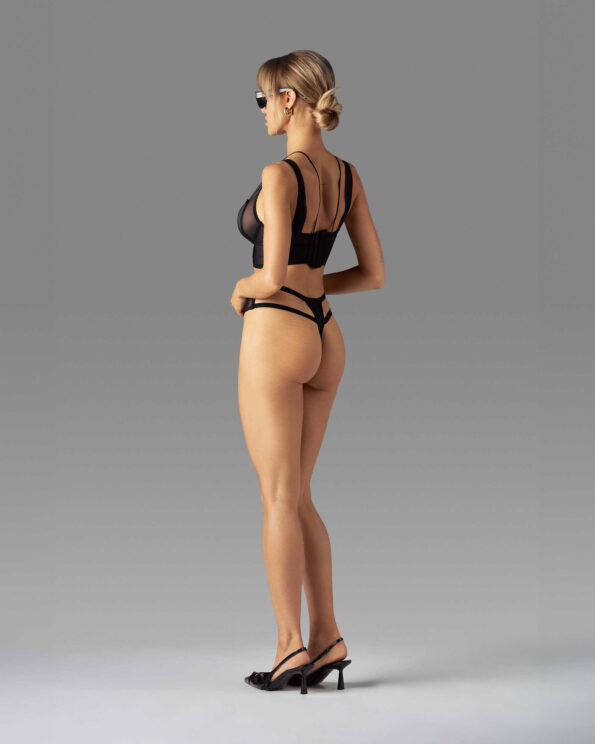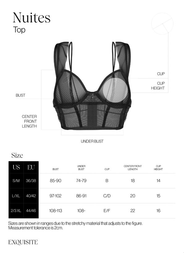 Nuites top L?harmonie parfaite entre utilité et style, le haut à armatures Nuites noir excelle dans les deux. Méticuleusement confectionné à partir de tissu haut de gamme qui se moule parfaitement à votre corps, il promet un ajustement élégant et flatteur. Le design allie fonctionnalité et beauté, avec des doubles bretelles décoratives et une fermeture à l?arrière avec crochets et ?illets réglables. Le look est complété par des garnitures élastiques et souples, équilibrant le confort avec une finition polie et raffinée.Principales caractéristiques :_ Haut noir classique avec bord moderne_ Tissu doux et de qualité supérieure qui est luxueux sur la peau_ Coutures décoratives verticales pour un look sophistiqué et structuré) Deux bretelles élégantes pour plus de style) Bonnets à armatures pour le soutien et la forme- Fermeture à crochet et à ?illet réglable à l?arrière pour un ajustement personnalisé- Détails noirs subtils pour une finition monochrome élégante_ Conçu et fabriqué dans l?UE? 94 % polyamide, 6 % élasthanne pour un équilibre parfait entre souplesse et durabilité