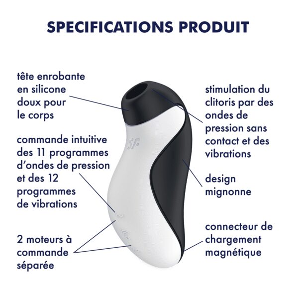 Informations produit « Satisfyer Orca »Rencontrez votre nouveau meilleur ami : grâce à ses 2 moteurs performants, l?adorable Satisfyer Orca vous permet de choisir entre vibrations puissantes ou ondes de pression sensuelles pour la stimulation clitoridienne.2 en 1 Stimulation du clitoris par pressions et vibrations simultanéesFabriqué en silicone médical ultra doux et respectueux de la peau, soyeux au toucher et extrêmement hygiéniqueGrâce à sa surface étanche (IPX7), ce jouet peut s?utiliser dans l?eau en toute sécurité et se nettoie facilement Garanti 15 ansStimulation du clitoris par ondes de pression sans contactSilicone doux pour le corpsÉtanche (IPX7)11 intensités d?ondes de pression + 12 programmes de vibrations2 moteurs à commandes séparéesMode silencieuxFacile à nettoyerBatterie au lithium-ionCâble de recharge magnétique USB inclusVibromasseur ludique à ondes de pression : le Satisfyer OrcaLe vibromasseur à ondes de pression Orca vous cajole avec notre valeur sûre : la technologie Airpulse, entièrement sans contact , et ses 11 intensités d’ondes de pression. Mais ce n’est pas tout : 12 nouveaux modes de vibrations viennent multiplier les possibilités de combinaison… Son corps svelte, en silicone doux pour la peau, vous assure un contrôle permanent. Grâce à son design de mammifère marin, il est tout désigné pour amadouer les débutants, ou encore comme cadeau.Satisfyer Orca ? ondes de pression et vibrationsGrâce à sa finition étanche (IPX7), vous pouvez emporter le vibromasseur sous la douche ou pour un bain relaxant. Après chaque utilisation, nettoyez-le simplement avec un peu d’eau tiède et un savon doux. Avec son câble de chargement USB inclus, vous pouvez rapidement et facilement recharger votre charmante baleine pour de nouvelles aventures. Caractéristiques « Satisfyer Orca »Longueur:115 mmPoids:115 gLargeur:56 mmConvient aux:FemmesAvec ondes de pression:OuiHauteur:49 mmAvec vibration:OuiStimulation :ClitoridienneÉtanche (IPX7):OuiBatterie:AccuMatériau:Plastique ABS, Silicone