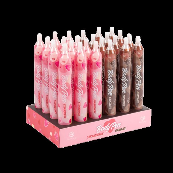 1 Présentoir Contenu: 12 body pen fraise et 12 body pen chocolat 35 gr/body pen 100% Comestible Amusement sans limite avec ces « stylos » avec lequels vous pouvez dessiner sur la peau et ensuite lécher l’encre savoureuse. Parce qu’il n’y a que du chocolat et fraise! Vous pouvez dessiner sur le corps de votre partenaire ou sur votre corps. Mettez de l´óriginalité et du goût dans vos préliminaires avec ces stylos à l´éncre comestibles. Très amusant pour les couples. Mode d’emploi : Peindre sur la zone du corps souhaitée.
