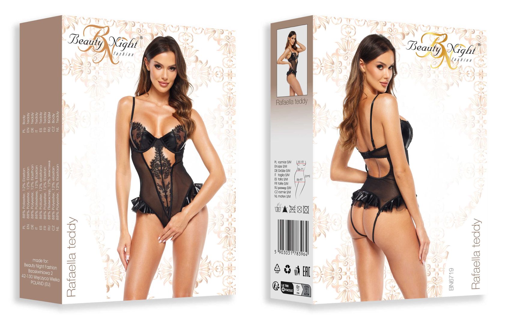Ce superbe corps de la série Rafaella est fabriqué à partir d?une combinaison de dentelle, tulle et wetlook, qui accentue la silhouette tout en ajoutant élégance et sensualité. Les bonnets sont ornés de dentelle délicate, mettant subtilement en valeur le buste d?une manière séduisante mais raffinée. Le devant ouvert, orné d?empiècements en tulle et dentelle, ajoute de la sophistication. Le dos est orné de volants ludiques, ajoutant une touche féminine pour compléter le look. Ce corps est le mélange parfait d?élégance et de sensualité, ce qui en fait un choix idéal pour les soirées romantiques et les occasions spéciales. Matériau : Le tulle délicat et les inserts wetlook magnifiquement soulignent les courbes. Bonnets : Ornés de dentelle, rehaussant subtilement le buste. Design : Ouvert devant avec des détails de dentelle et découpe. Dos : Décoré de volants ludiques, ajoutant une touche légère et féminine. Sangles réglables : assurant un ajustement parfait. Fermeture : Crochet et ?illet à l?arrière pour un port confortable. Utilisation : Parfait pour les occasions spéciales ou les soirées sensuelles. Prêt à offrir : Le corps est livré dans une boîte élégante avec l?image du produit.La dentelle et les détails subtils vous feront sentir belle et sensuelle.Messieurs, offrez quelque chose qui enchantera votre bien-aimé.Taille : S/M et L/XLTaille S/M : (Poitrine : 81-91 cm, B-C, Taille : 56-71 cm, Hanche : 85-97 cm)Taille L/XL : (Poitrine : 91-107 cm, C-D, Taille : 71-91 cm, Hanche : 97-112 cm)Matière : 88 % polyester, 12 % élasthanne