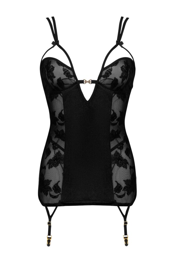 La superbe robe « Xiomara » en dentelle délicate et velours qui accentue la silhouette féminine. Les bonnets à armatures rehaussent magnifiquement le buste, et les bretelles réglables assurent un confort. Le dos de la robe est agrémenté d?un impressionnant laçage qui lui confère une élégance particulière. Les bretelles en jarretière complètent l?allure sensuelle de la robe. L?ensemble comprend des culottes de velours qui s?harmonisent parfaitement avec la robe. Parfait pour les soirées romantiques et les occasions spéciales. L?ensemble est livré dans un emballage élégant avec une photo du produit. Taille : S/M et L/XLTaille S/M : (Poitrine : 81-91 cm, B-C, Taille : 56-71 cm, Hanche : 85-97 cm)Taille L/XL : (Poitrine : 91-107 cm, C-D, Taille : 71-91 cm, Hanche : 97-112 cm)Matière : 88% polyester, 12% élasthanne